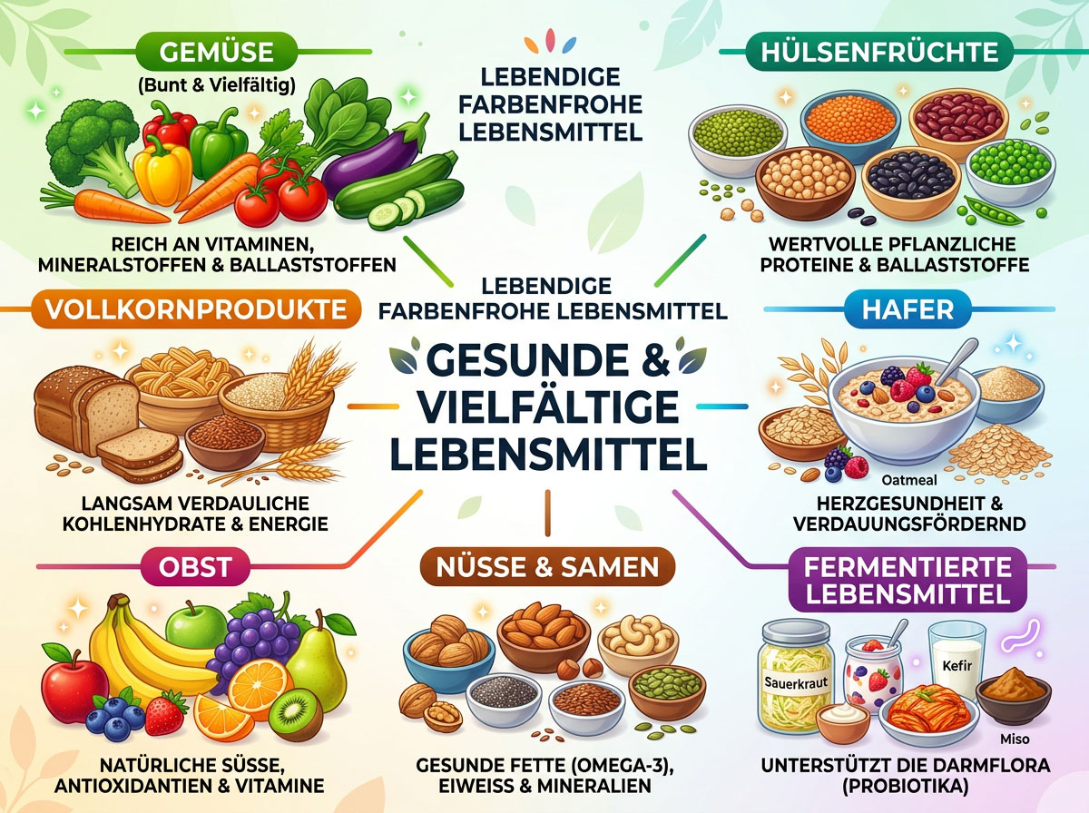 Besonders günstig sind Gemüse, Hülsenfrüchte, Vollkornprodukte, Hafer, Obst, Nüsse, Samen und in vielen Fällen fermentierte Lebensmittel. Entscheidend ist weniger ein einzelnes „Wunderlebensmittel“ als die regelmäßige Vielfalt.